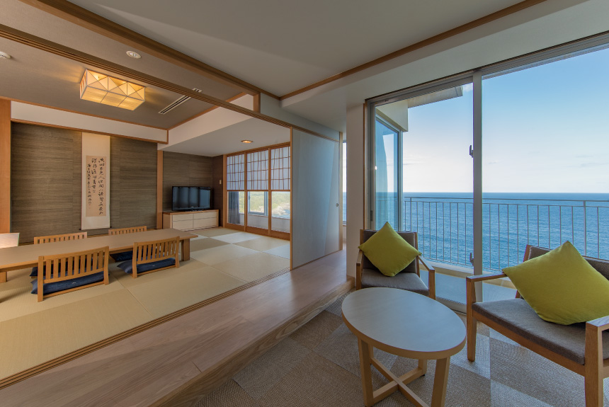 お部屋全体を優しく照らす間接照明、読書灯を兼ねたナイトランプと行燈、素足でくつろげるタタミが落ち着きのある快適な時間を演出します。ゆったりとした和の空間で、悠久なる景色に癒されながら、心やすらぐ至福の時間をお過ごしください。