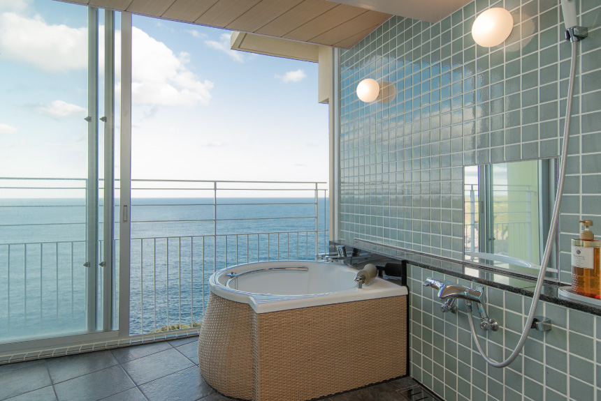 お部屋のお風呂は、ご滞在中いつでもご入浴可能な天然温泉。窓の外に広がる海岸線を眺めながらのご入浴をお楽しみください。